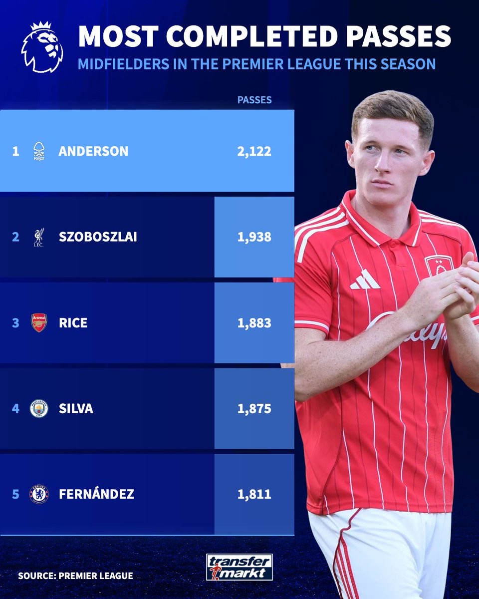 森林的安德森以2122次成功传球居首,索博斯洛伊和赖斯分别以1938和1883次排名二三。